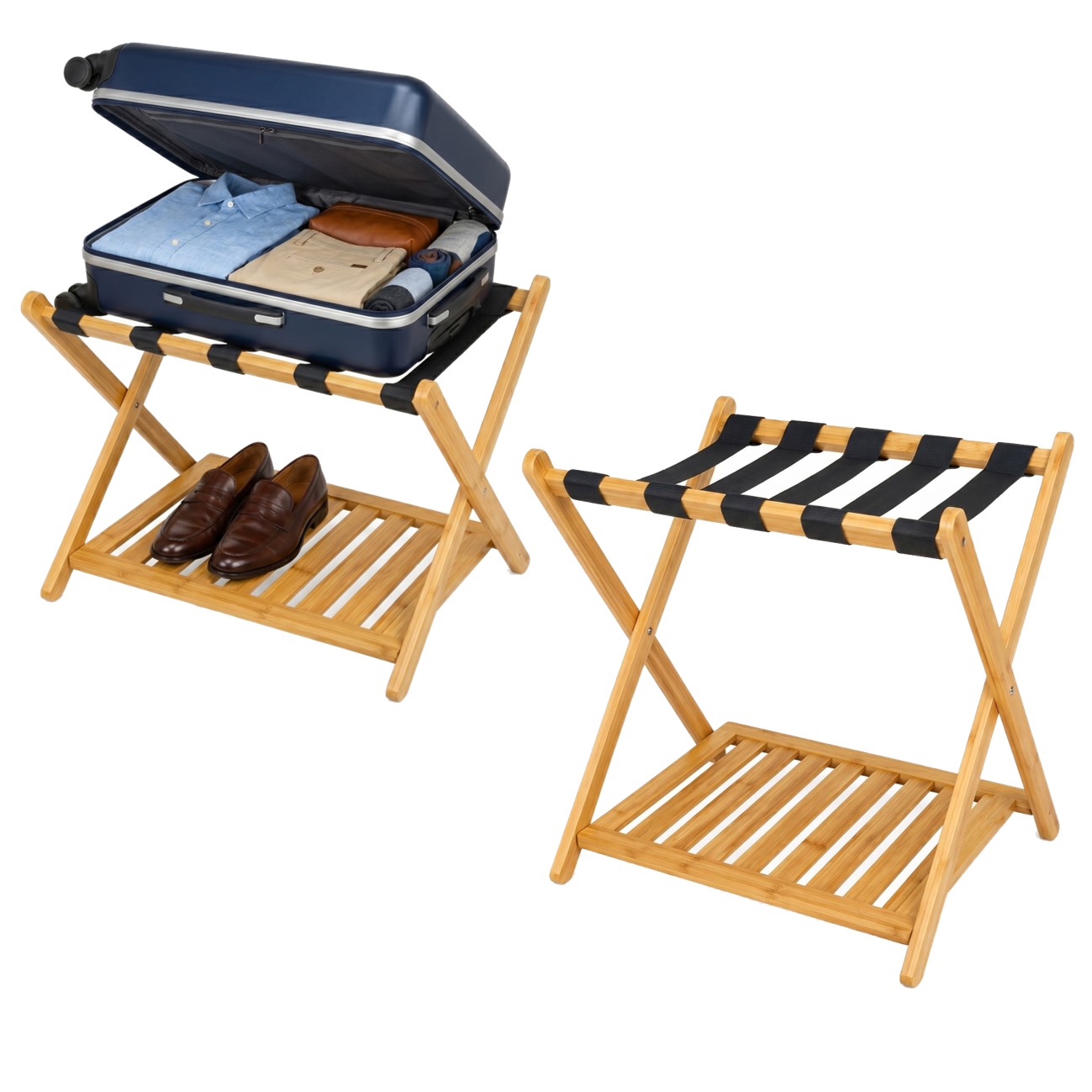 Kit 2 Suporte de Mala Bambu Natural Com Prateleira Sapateira Para Hotel Pousada - AMZ