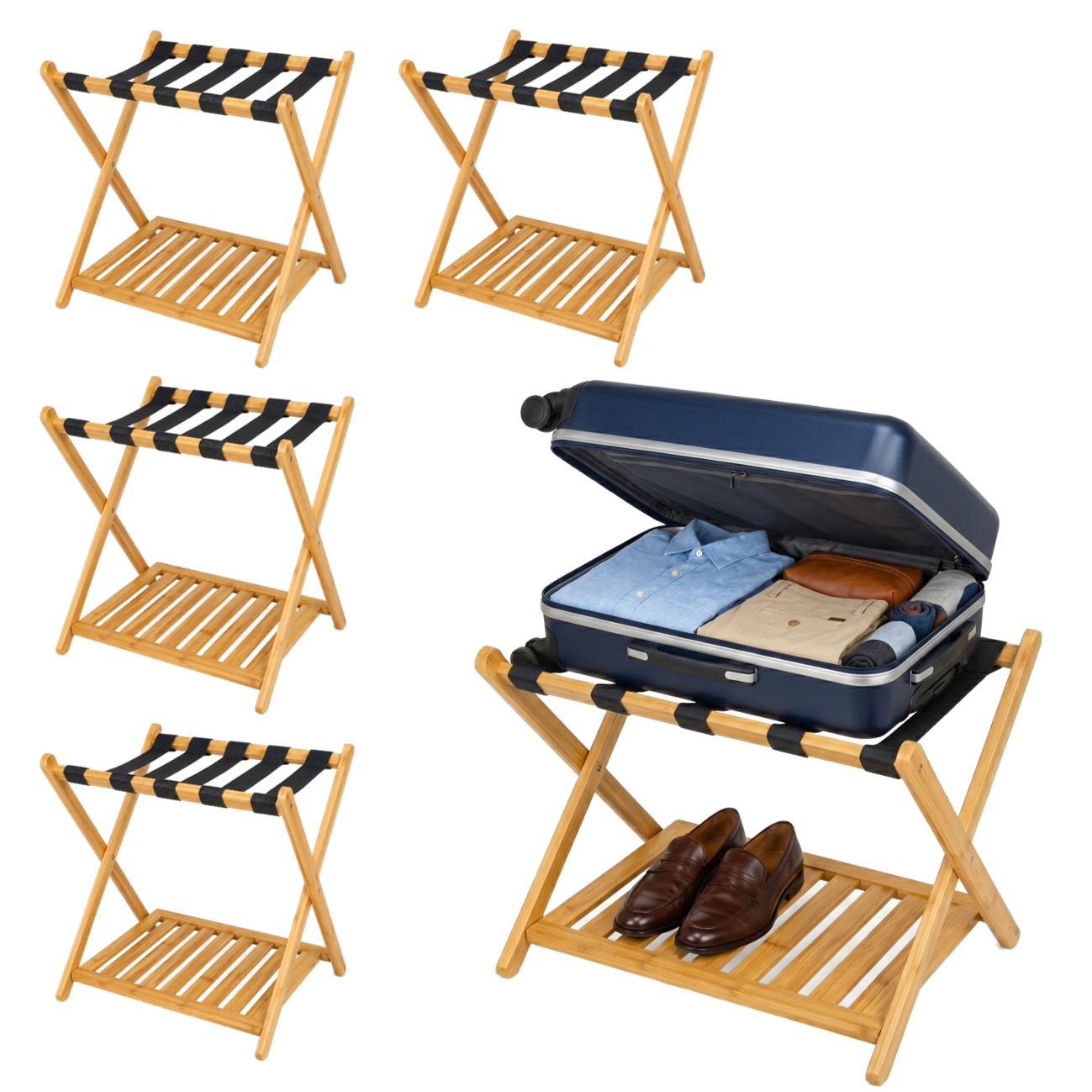 Kit 5 Suporte de Mala Bambu Natural Com Prateleira Sapateira Para Hotel Pousada - AMZ