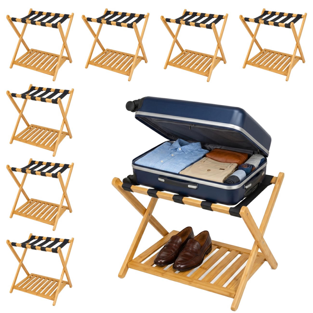 Eleve o padrão de conforto e organização da sua hospedagem ou quarto de hóspedes. Fabricado em bambu natural, este suporte une design elegante, sustentabilidade e alta funcionalidade, sendo a escolha ideal para hotéis, pousadas, locações por temporada como Airbnb ou para a sua casa.