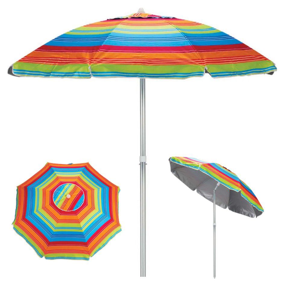 Possui varetas de fibra de vidro reforçadas e uma saída de ar no topo que auxilia na sua estabilidade no chão e para facilitar seu armazenamento e transporte, acompanha prática sacola. Com 2m de diâmetro e haste de 2,09m de comprimento o Guarda-Sol Alumínio apresenta estampa colorida para alegrar a sua área de lazer.