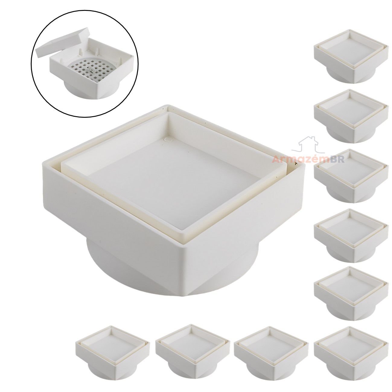 Kit 10 Ralo Oculto Invisível Quadrado 10x10cm Plástico Com Tela Para Banheiro - AMZ - Branco