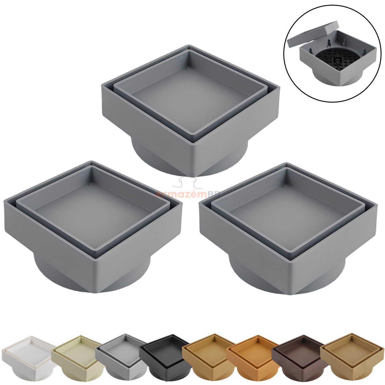 Kit 3 Ralo Oculto Invisível Quadrado 10x10cm Plástico Com Tela Para Banheiro - AMZ - Cinza Escuro