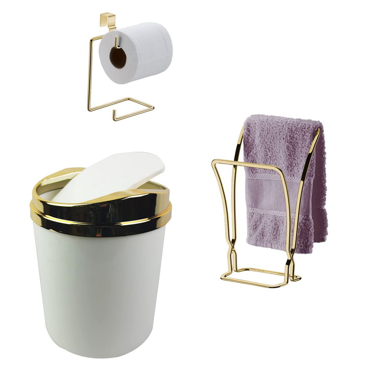 Kit Banheiro Dourado Porta Toalha Duplo Rosto + Suporte Papel Higiênico + Lixeira - Future - Branco