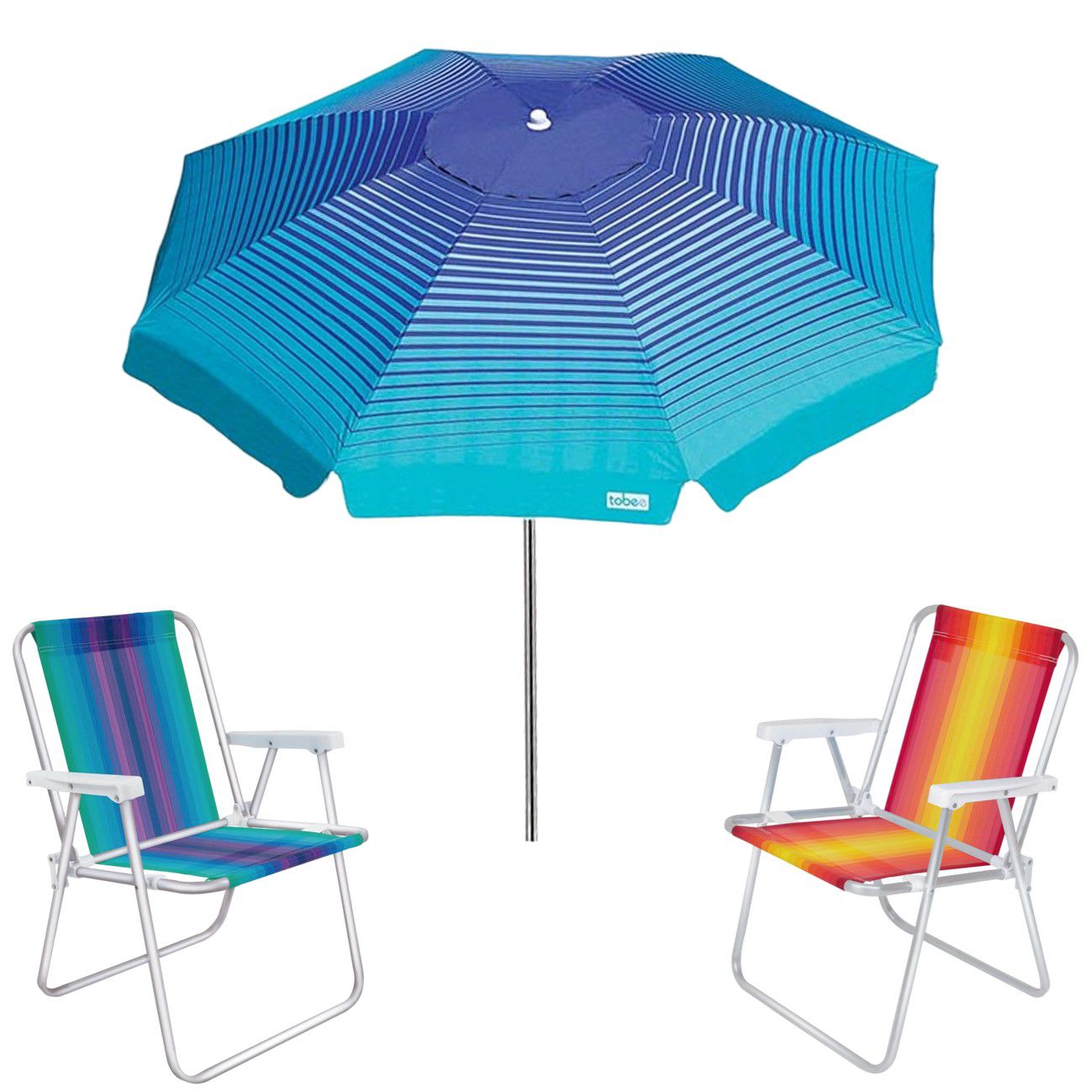 Kit Guarda Sol 2,2m Articulado Cancun Azul 2 Cadeira Alta Alumínio Praia Piscina Camping - Tobee