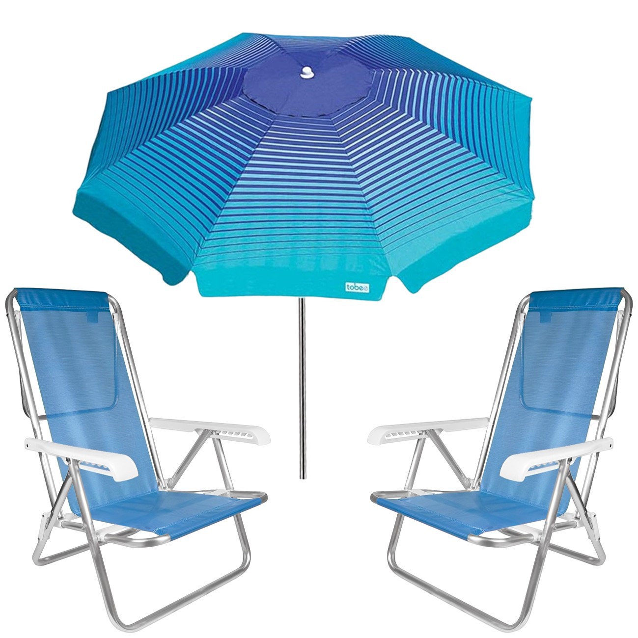 Kit Guarda Sol 2,2m Articulado Cancun Azul Cadeira 8 Posições Alumínio Sannet Praia Piscina Camping - Azul