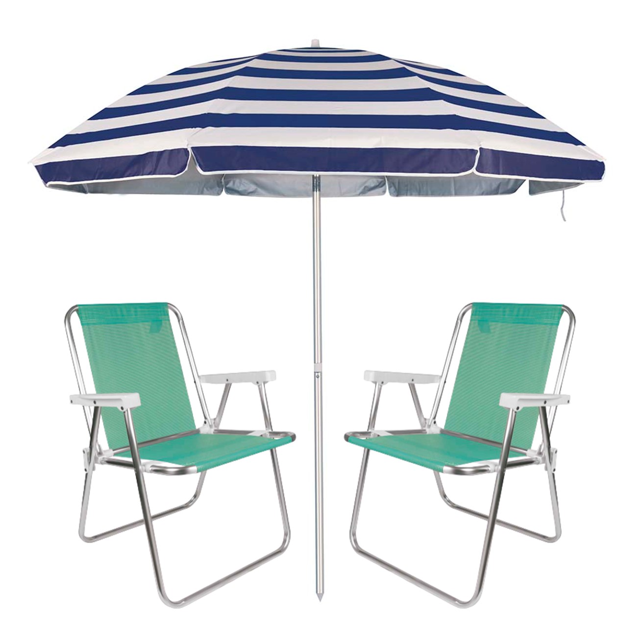 Kit Praia 2 Cadeira Alta Sannet Alumínio + Guarda Sol 2m Sombreiro Alumínio - Mor - Azul Listrado