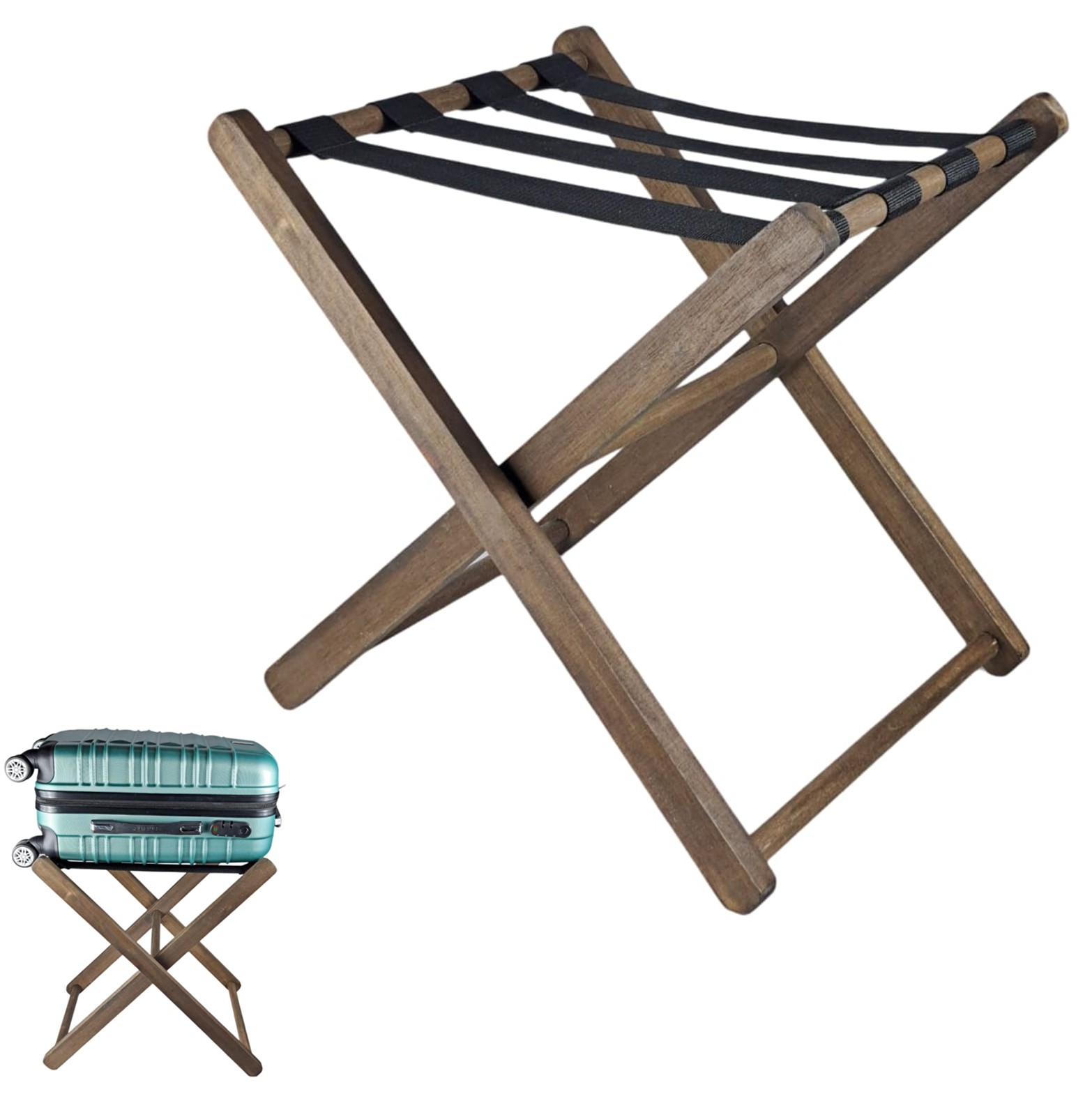 Organize e decore seu quarto com o Suporte de Mala em Madeira. Dobrável e leve, oferece praticidade e beleza, facilitando a arrumação de malas e bagagens. Ideal para hotéis e residências.